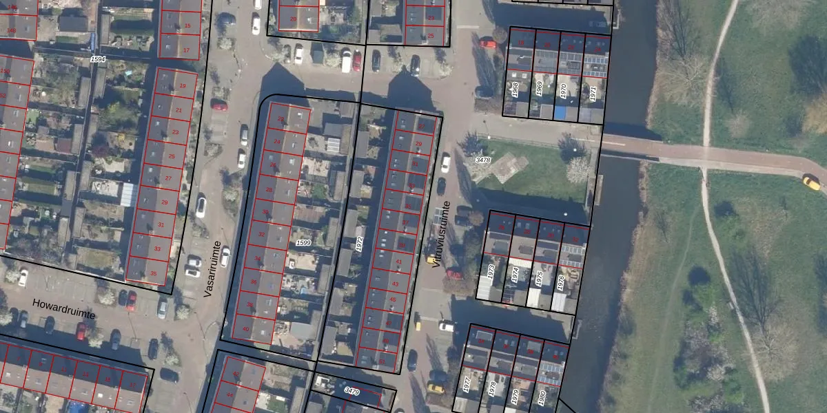 Het perceel waarop Vitruviusruimte 35 staat heeft een oppervlakte van 1245 m². Dit is een zeer groot perceel. De perceeloppervlakte wordt geregistreerd door het Kadaster. Gedetailleerde informatie over de maten van dit perceel kunt u vinden in het rapport Kadastrale kaart met maatvoering van Vitruviusruimte 35.