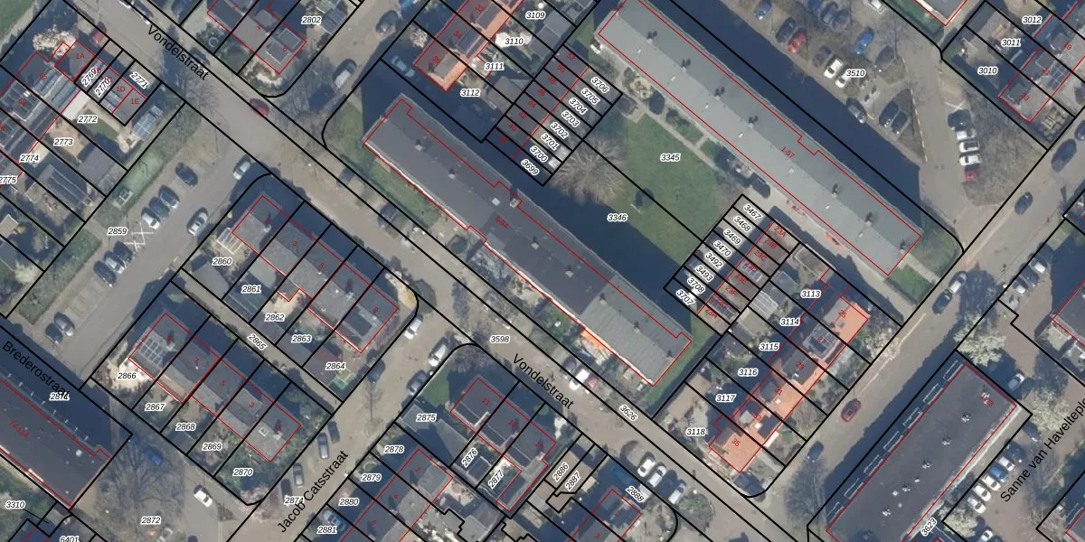Het perceel waarop Vondelstraat 26 staat heeft een oppervlakte van 1932 m². Dit is een zeer groot perceel. De perceeloppervlakte wordt geregistreerd door het Kadaster. Gedetailleerde informatie over de maten van dit perceel kunt u vinden in het rapport Kadastrale kaart met maatvoering van Vondelstraat 26.