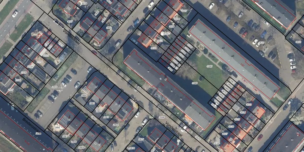 Het perceel waarop Vondelstraat 38 staat heeft een oppervlakte van 1932 m². Dit is een zeer groot perceel. De perceeloppervlakte wordt geregistreerd door het Kadaster. Gedetailleerde informatie over de maten van dit perceel kunt u vinden in het rapport Kadastrale kaart met maatvoering van Vondelstraat 38.