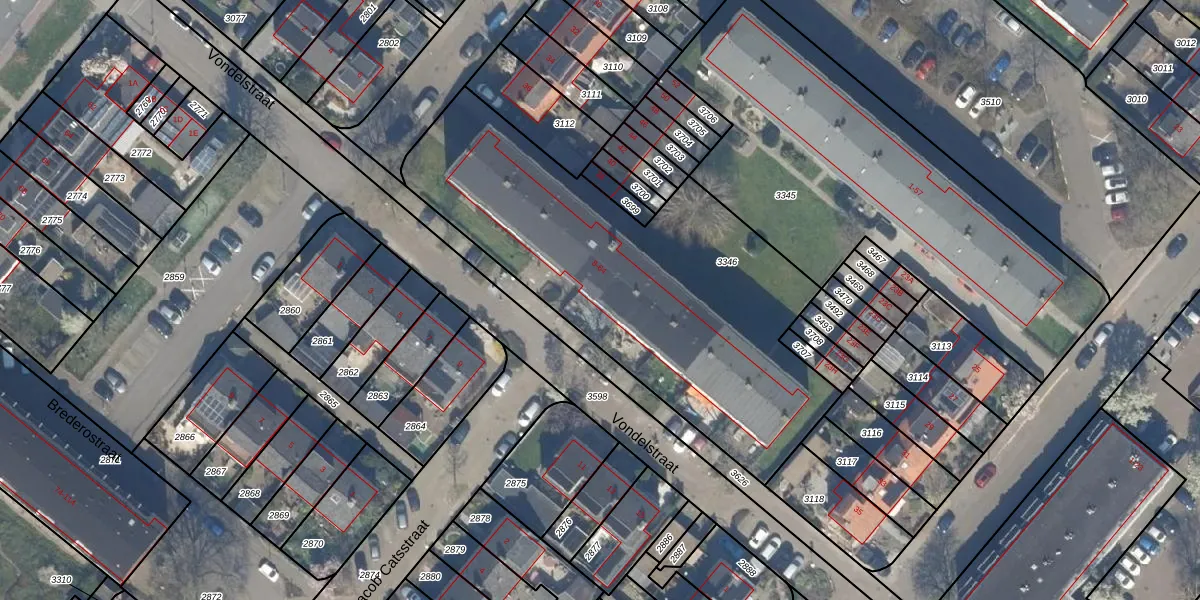 Het perceel waarop Vondelstraat 8 staat heeft een oppervlakte van 1932 m². Dit is een zeer groot perceel. De perceeloppervlakte wordt geregistreerd door het Kadaster. Gedetailleerde informatie over de maten van dit perceel kunt u vinden in het rapport Kadastrale kaart met maatvoering van Vondelstraat 8.