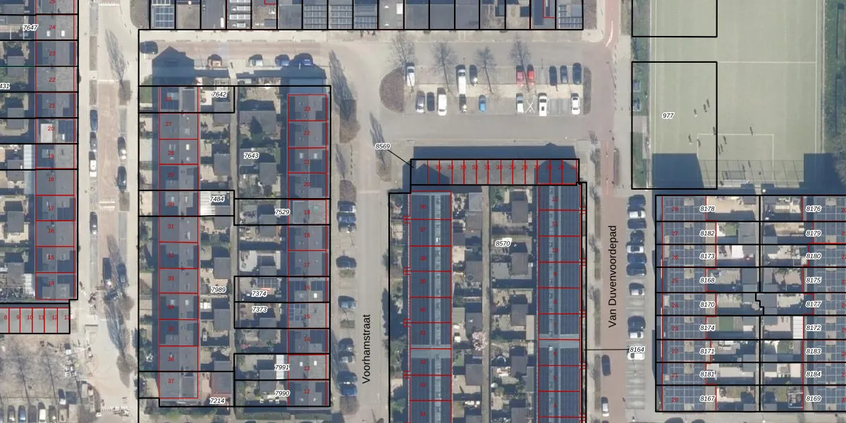 Het perceel waarop Voorhamstraat 36 staat heeft een oppervlakte van 3424 m². Dit is een zeer groot perceel. De perceeloppervlakte wordt geregistreerd door het Kadaster. Gedetailleerde informatie over de maten van dit perceel kunt u vinden in het rapport Kadastrale kaart met maatvoering van Voorhamstraat 36.