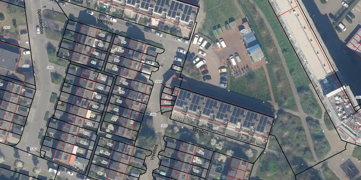 Het perceel waarop Vreebos 45 staat heeft een oppervlakte van 1010 m². Dit is een zeer groot perceel. De perceeloppervlakte wordt geregistreerd door het Kadaster. Gedetailleerde informatie over de maten van dit perceel kunt u vinden in het rapport Kadastrale kaart met maatvoering van Vreebos 45.