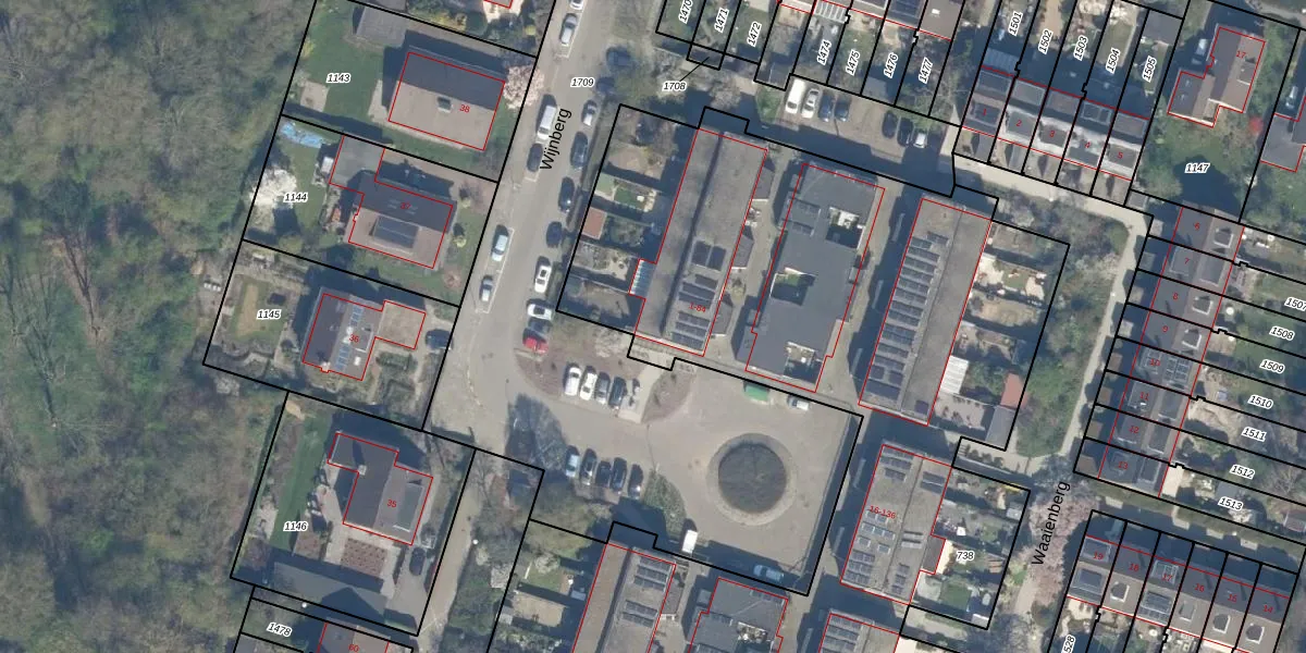 Het perceel waarop Wijnberg 1 staat heeft een oppervlakte van 5853 m². Dit is een zeer groot perceel. De perceeloppervlakte wordt geregistreerd door het Kadaster. Gedetailleerde informatie over de maten van dit perceel kunt u vinden in het rapport Kadastrale kaart met maatvoering van Wijnberg 1.