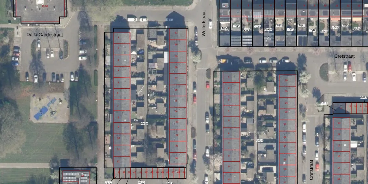 Het perceel waarop Wolfertstraat 56 staat heeft een oppervlakte van 3428 m². Dit is een zeer groot perceel. De perceeloppervlakte wordt geregistreerd door het Kadaster. Gedetailleerde informatie over de maten van dit perceel kunt u vinden in het rapport Kadastrale kaart met maatvoering van Wolfertstraat 56.