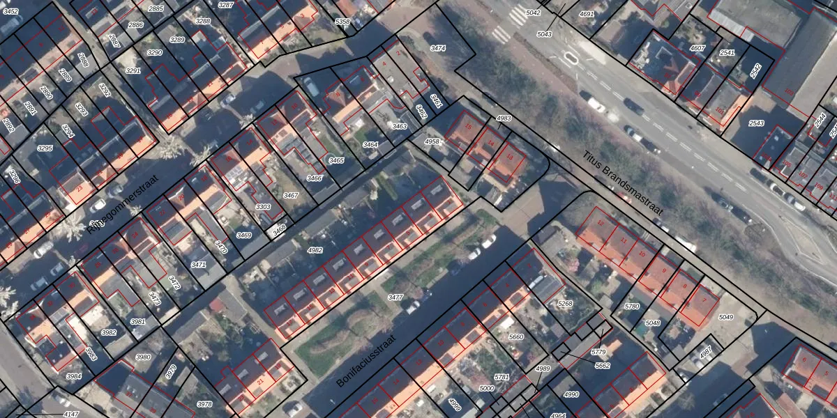 Het perceel waarop Bonifaciusstraat 3 staat heeft een oppervlakte van 2023 m². Dit is een zeer groot perceel. De perceeloppervlakte wordt geregistreerd door het Kadaster. Gedetailleerde informatie over de maten van dit perceel kunt u vinden in het rapport Kadastrale kaart met maatvoering van Bonifaciusstraat 3.