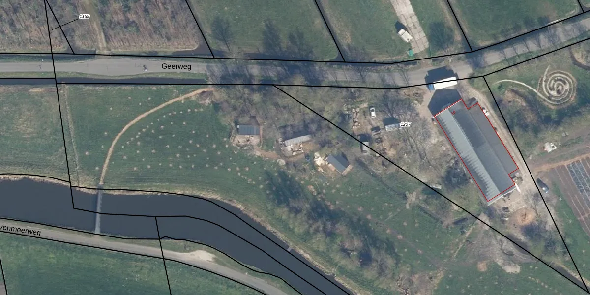 Het perceel waarop Geerweg 9-B staat heeft een oppervlakte van 2,2 ha. Dit is een zeer groot perceel. De perceeloppervlakte wordt geregistreerd door het Kadaster. Gedetailleerde informatie over de maten van dit perceel kunt u vinden in het rapport Kadastrale kaart met maatvoering van Geerweg 9-B.