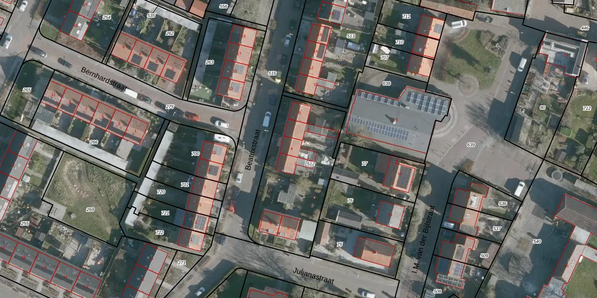 Het perceel waarop Beatrixstraat 4 staat heeft een oppervlakte van 1104 m². Dit is een zeer groot perceel. De perceeloppervlakte wordt geregistreerd door het Kadaster. Gedetailleerde informatie over de maten van dit perceel kunt u vinden in het rapport Kadastrale kaart met maatvoering van Beatrixstraat 4.