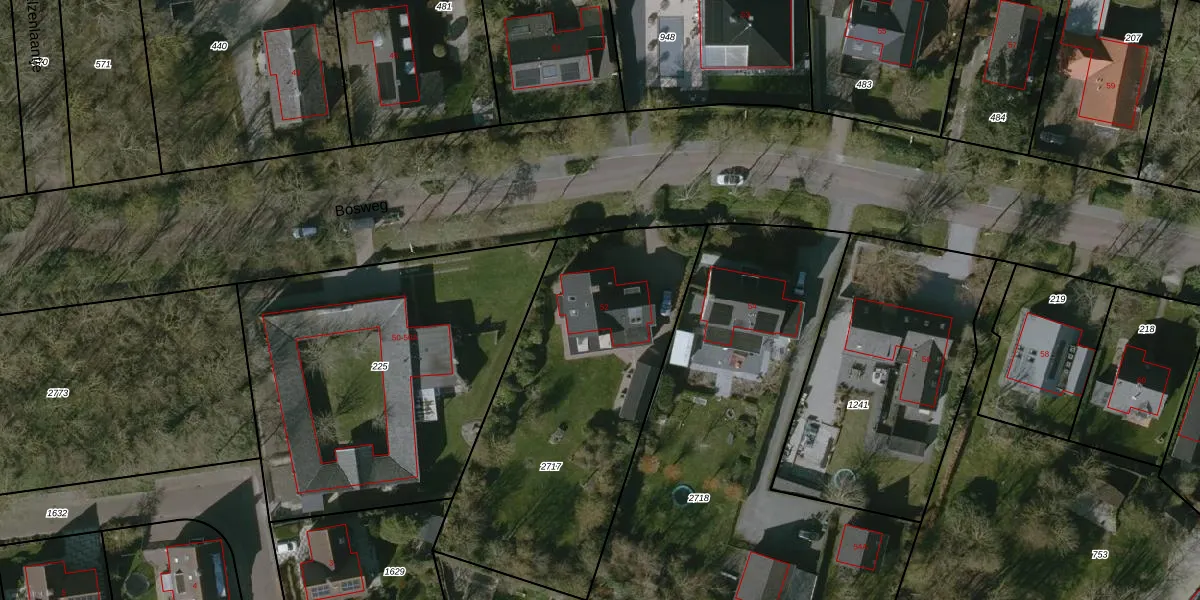 Het perceel waarop Bosweg 52 staat heeft een oppervlakte van 1525 m². Dit is een zeer groot perceel. De perceeloppervlakte wordt geregistreerd door het Kadaster. Gedetailleerde informatie over de maten van dit perceel kunt u vinden in het rapport Kadastrale kaart met maatvoering van Bosweg 52.