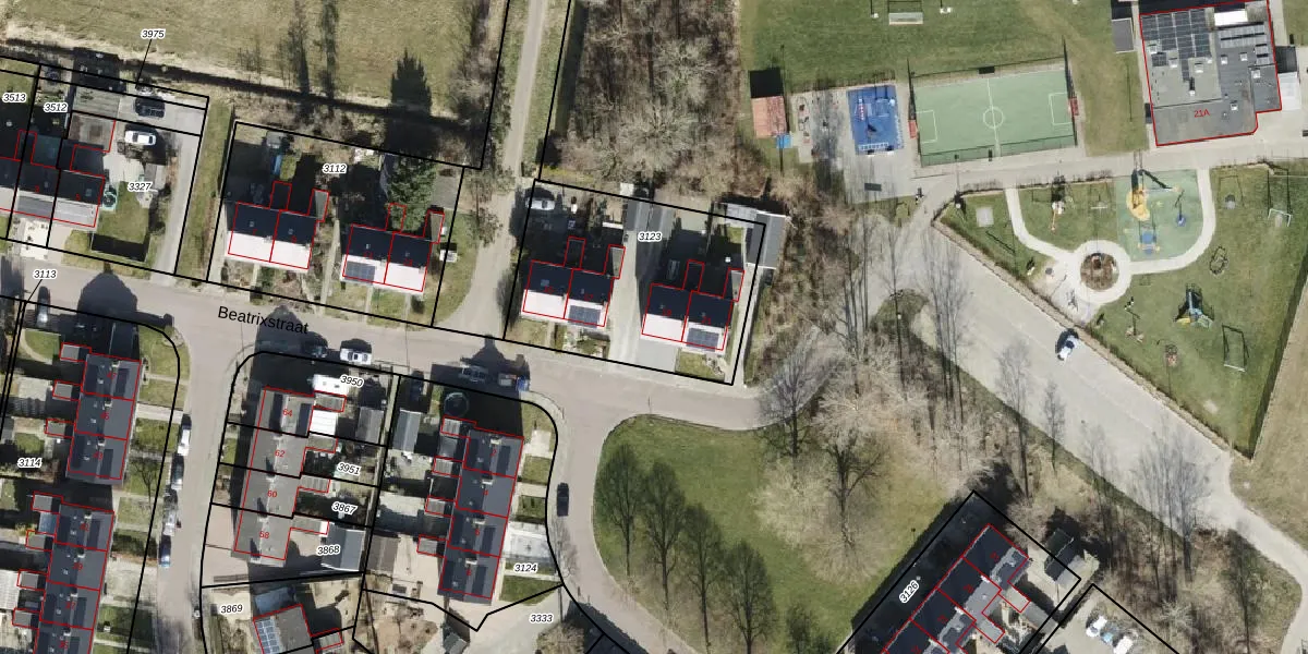 Het perceel waarop Beatrixstraat 19 staat heeft een oppervlakte van 895 m². Dit is een groot perceel. De perceeloppervlakte wordt geregistreerd door het Kadaster. Gedetailleerde informatie over de maten van dit perceel kunt u vinden in het rapport Kadastrale kaart met maatvoering van Beatrixstraat 19.