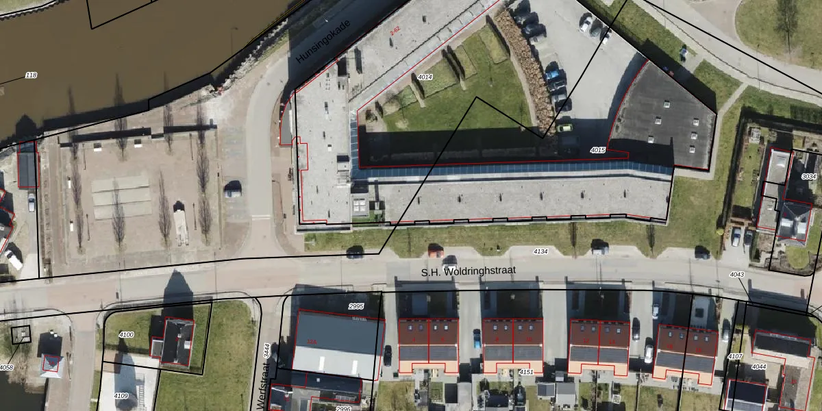 Het perceel waarop Hunsingokade 4 staat heeft een oppervlakte van 2011 m². Dit is een zeer groot perceel. De perceeloppervlakte wordt geregistreerd door het Kadaster. Gedetailleerde informatie over de maten van dit perceel kunt u vinden in het rapport Kadastrale kaart met maatvoering van Hunsingokade 4.