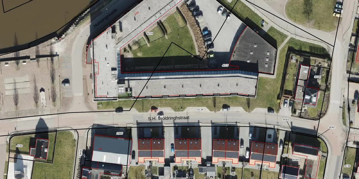 Het perceel waarop Hunsingokade 8 staat heeft een oppervlakte van 2011 m². Dit is een zeer groot perceel. De perceeloppervlakte wordt geregistreerd door het Kadaster. Gedetailleerde informatie over de maten van dit perceel kunt u vinden in het rapport Kadastrale kaart met maatvoering van Hunsingokade 8.