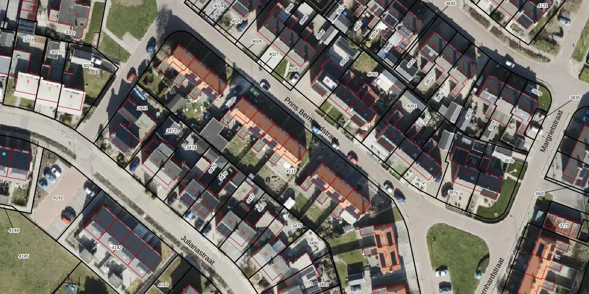 Het perceel waarop Prins Bernhardstraat 17 staat heeft een oppervlakte van 3062 m². Dit is een zeer groot perceel. De perceeloppervlakte wordt geregistreerd door het Kadaster. Gedetailleerde informatie over de maten van dit perceel kunt u vinden in het rapport Kadastrale kaart met maatvoering van Prins Bernhardstraat 17.