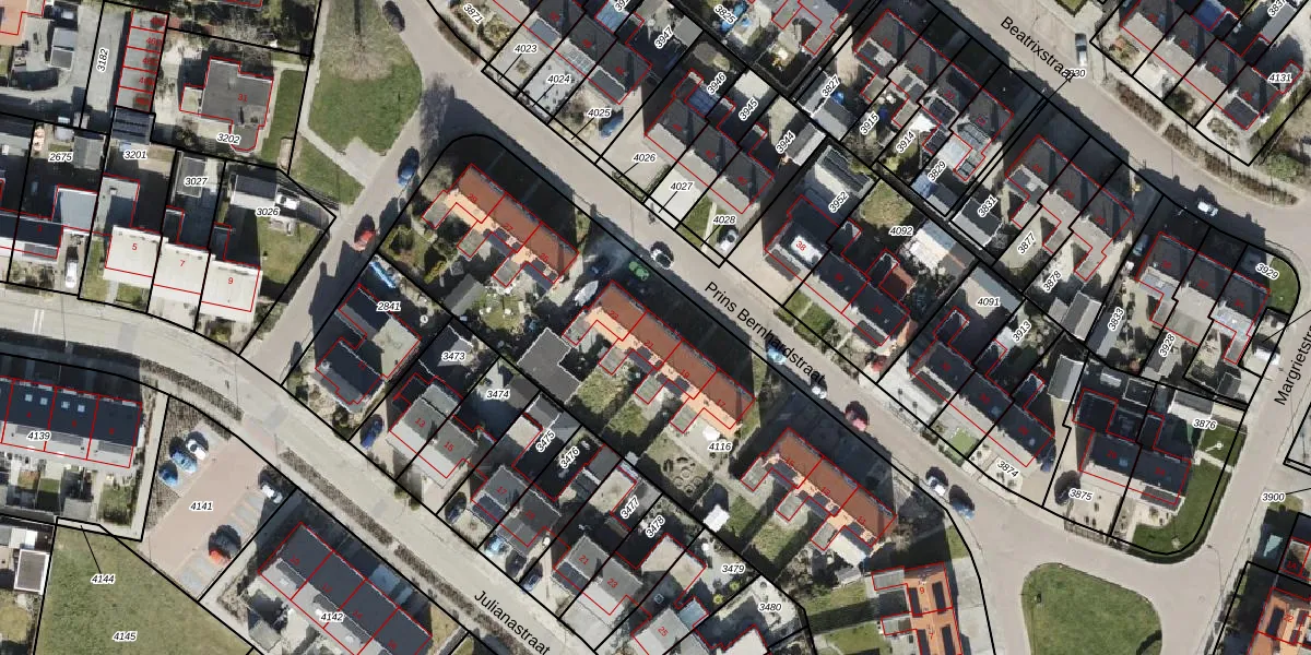 Het perceel waarop Prins Bernhardstraat 21 staat heeft een oppervlakte van 3062 m². Dit is een zeer groot perceel. De perceeloppervlakte wordt geregistreerd door het Kadaster. Gedetailleerde informatie over de maten van dit perceel kunt u vinden in het rapport Kadastrale kaart met maatvoering van Prins Bernhardstraat 21.