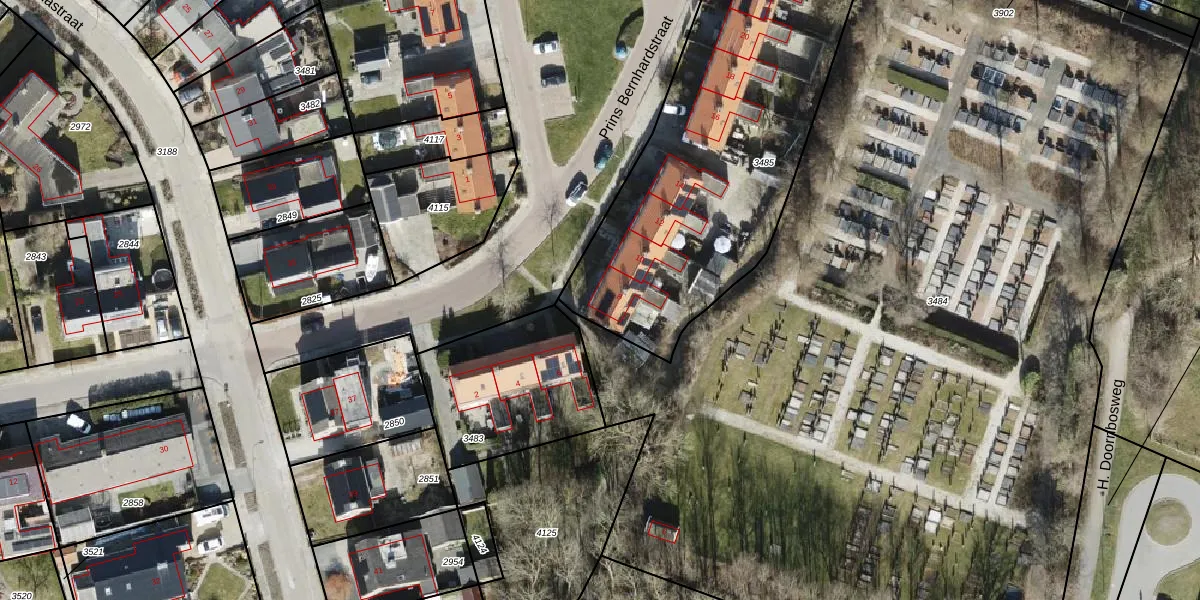 Het perceel waarop Prins Bernhardstraat 8 staat heeft een oppervlakte van 1640 m². Dit is een zeer groot perceel. De perceeloppervlakte wordt geregistreerd door het Kadaster. Gedetailleerde informatie over de maten van dit perceel kunt u vinden in het rapport Kadastrale kaart met maatvoering van Prins Bernhardstraat 8.