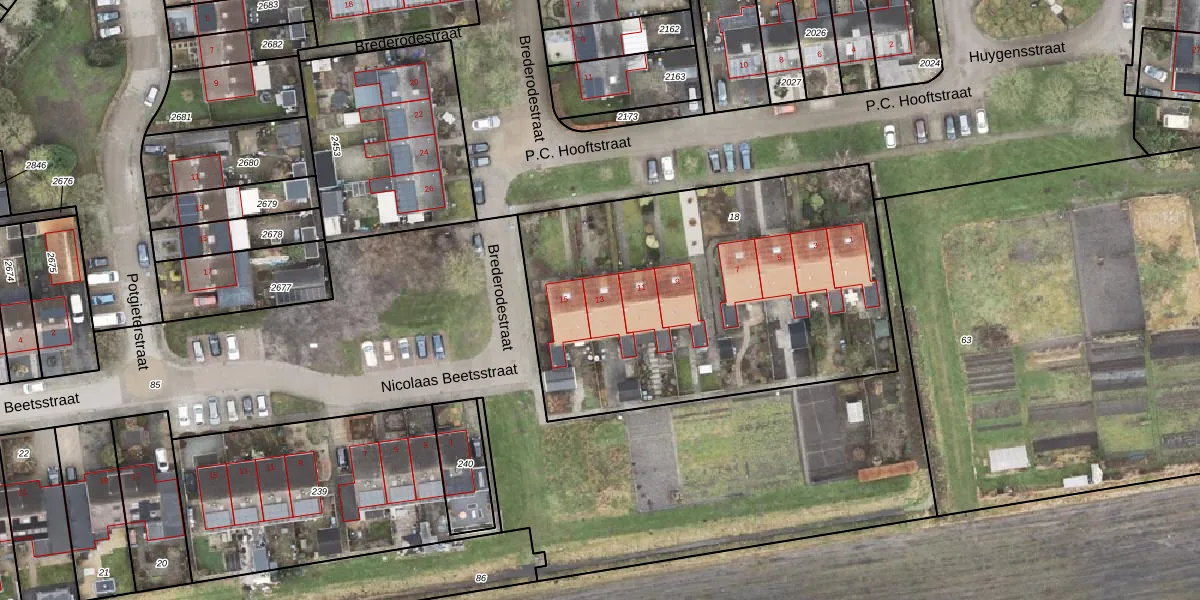 Het perceel waarop P.C. Hooftstraat 13 staat heeft een oppervlakte van 2060 m². Dit is een zeer groot perceel. De perceeloppervlakte wordt geregistreerd door het Kadaster. Gedetailleerde informatie over de maten van dit perceel kunt u vinden in het rapport Kadastrale kaart met maatvoering van P.C. Hooftstraat 13.