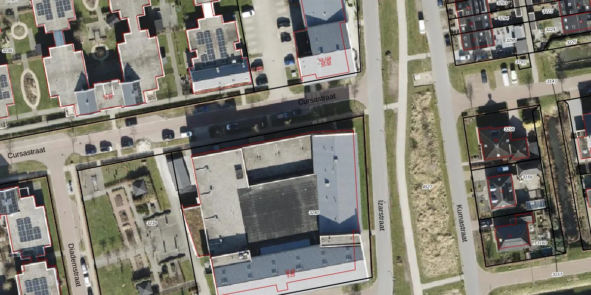 Het perceel waarop Cursastraat 13 staat heeft een oppervlakte van 3409 m². Dit is een zeer groot perceel. De perceeloppervlakte wordt geregistreerd door het Kadaster. Gedetailleerde informatie over de maten van dit perceel kunt u vinden in het rapport Kadastrale kaart met maatvoering van Cursastraat 13.
