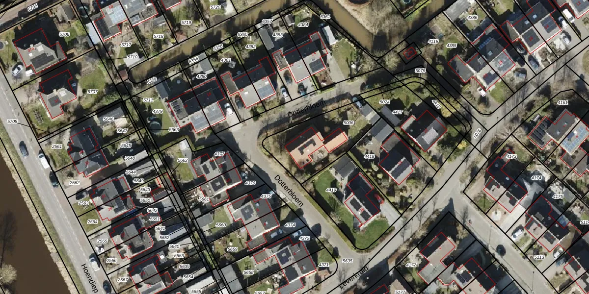 Het perceel waarop Dotterbloem 1 staat heeft een oppervlakte van 560 m². Dit is een groot perceel. De perceeloppervlakte wordt geregistreerd door het Kadaster. Gedetailleerde informatie over de maten van dit perceel kunt u vinden in het rapport Kadastrale kaart met maatvoering van Dotterbloem 1.