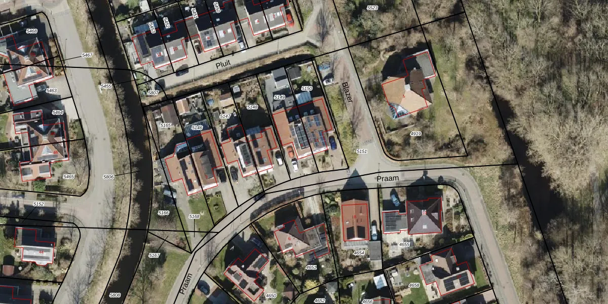 Het perceel waarop Praam 9 staat heeft een oppervlakte van 350 m². Dit is een groot perceel. De perceeloppervlakte wordt geregistreerd door het Kadaster. Gedetailleerde informatie over de maten van dit perceel kunt u vinden in het rapport Kadastrale kaart met maatvoering van Praam 9.