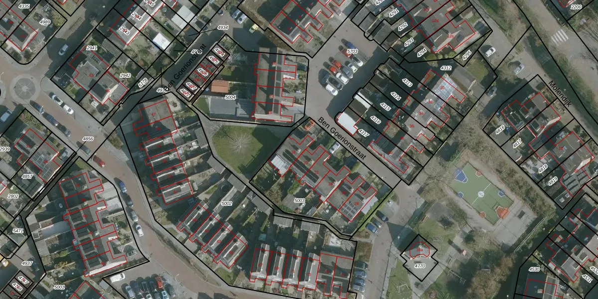 Ben Goerionstraat 18 is gelegen op kadastraal perceel ZLD01B5003. Deze kadastrale aanduiding is uniek en wordt gebruikt door het Kadaster om eigendomsrechten en andere zakelijke rechten vast te leggen. Het perceel maakt onderdeel uit van de kadastrale gemeente Zuidland.