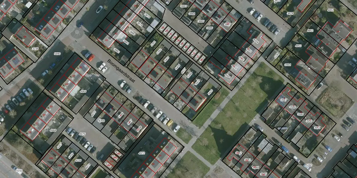 Boomgaardstraat 9 is gelegen op kadastraal perceel ZLD01B5394. Deze kadastrale aanduiding is uniek en wordt gebruikt door het Kadaster om eigendomsrechten en andere zakelijke rechten vast te leggen. Het perceel maakt onderdeel uit van de kadastrale gemeente Zuidland.