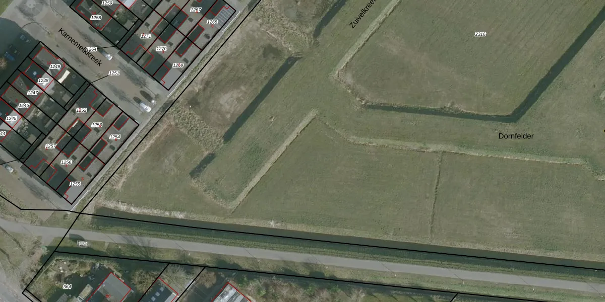 Het perceel waarop Dornfelder 2 staat heeft een oppervlakte van 2,5 ha. Dit is een zeer groot perceel. De perceeloppervlakte wordt geregistreerd door het Kadaster. Gedetailleerde informatie over de maten van dit perceel kunt u vinden in het rapport Kadastrale kaart met maatvoering van Dornfelder 2.