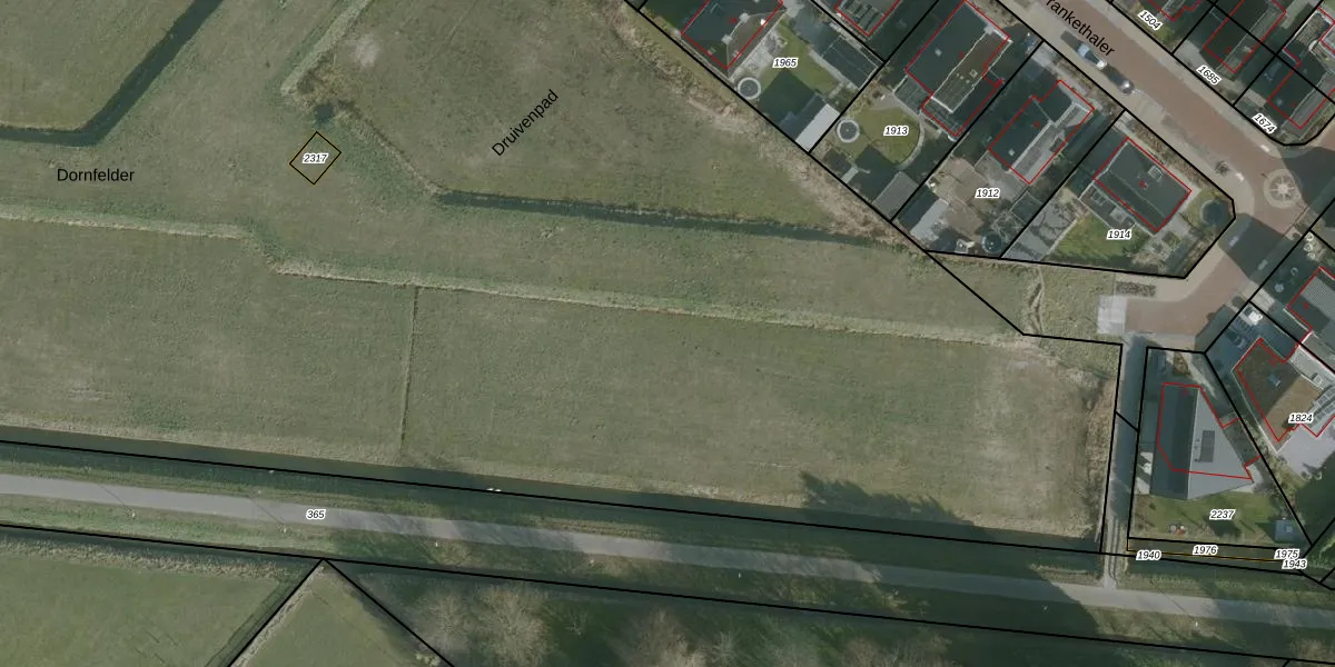 Het perceel waarop Dornfelder 24 staat heeft een oppervlakte van 2,5 ha. Dit is een zeer groot perceel. De perceeloppervlakte wordt geregistreerd door het Kadaster. Gedetailleerde informatie over de maten van dit perceel kunt u vinden in het rapport Kadastrale kaart met maatvoering van Dornfelder 24.