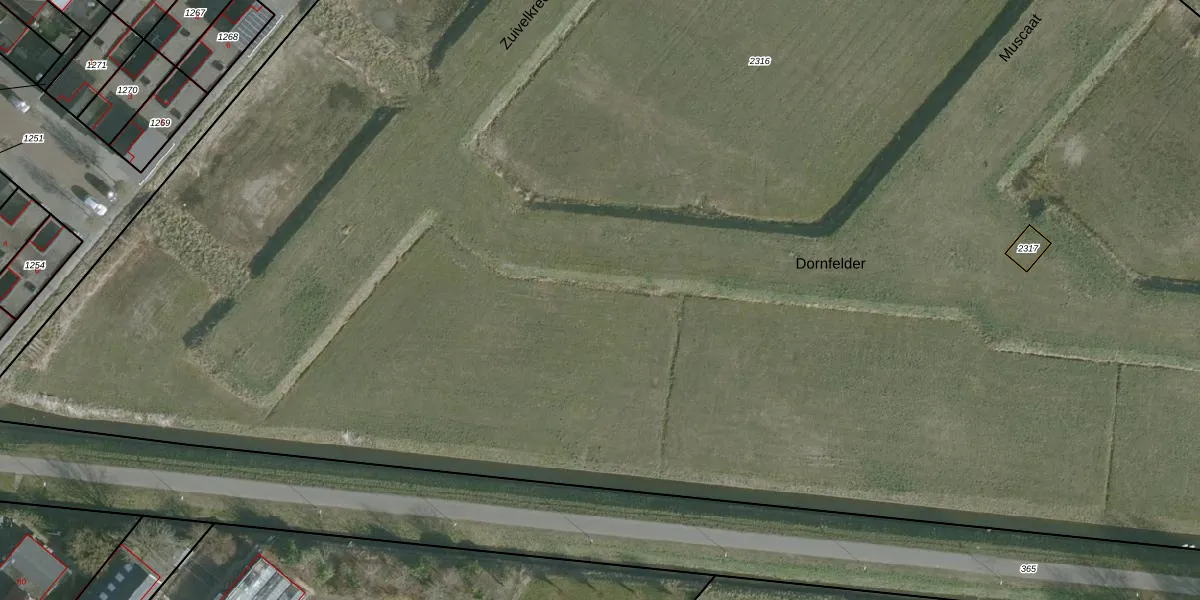 Het perceel waarop Dornfelder 6 staat heeft een oppervlakte van 2,5 ha. Dit is een zeer groot perceel. De perceeloppervlakte wordt geregistreerd door het Kadaster. Gedetailleerde informatie over de maten van dit perceel kunt u vinden in het rapport Kadastrale kaart met maatvoering van Dornfelder 6.