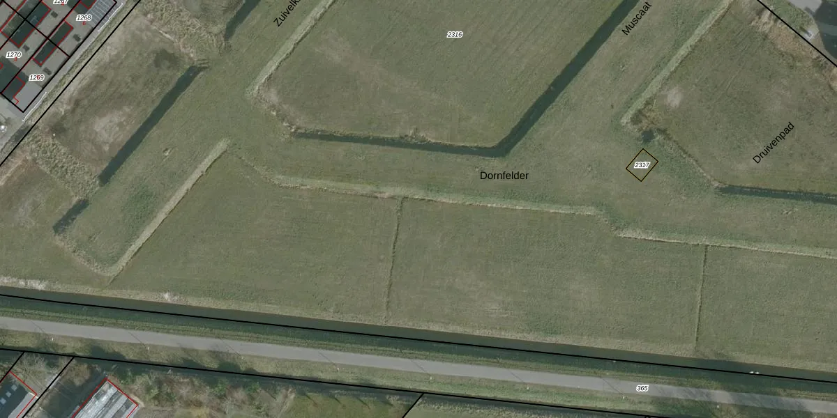 Het perceel waarop Dornfelder 8 staat heeft een oppervlakte van 2,5 ha. Dit is een zeer groot perceel. De perceeloppervlakte wordt geregistreerd door het Kadaster. Gedetailleerde informatie over de maten van dit perceel kunt u vinden in het rapport Kadastrale kaart met maatvoering van Dornfelder 8.