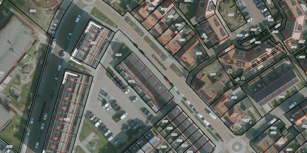 Het perceel waarop Emmastraat 25 staat heeft een oppervlakte van 632 m². Dit is een groot perceel. De perceeloppervlakte wordt geregistreerd door het Kadaster. Gedetailleerde informatie over de maten van dit perceel kunt u vinden in het rapport Kadastrale kaart met maatvoering van Emmastraat 25.