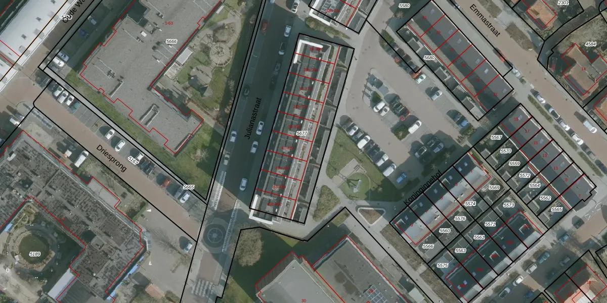 Julianastraat 41-a is gelegen op kadastraal perceel ZLD01B5677. Deze kadastrale aanduiding is uniek en wordt gebruikt door het Kadaster om eigendomsrechten en andere zakelijke rechten vast te leggen. Het perceel maakt onderdeel uit van de kadastrale gemeente Zuidland.