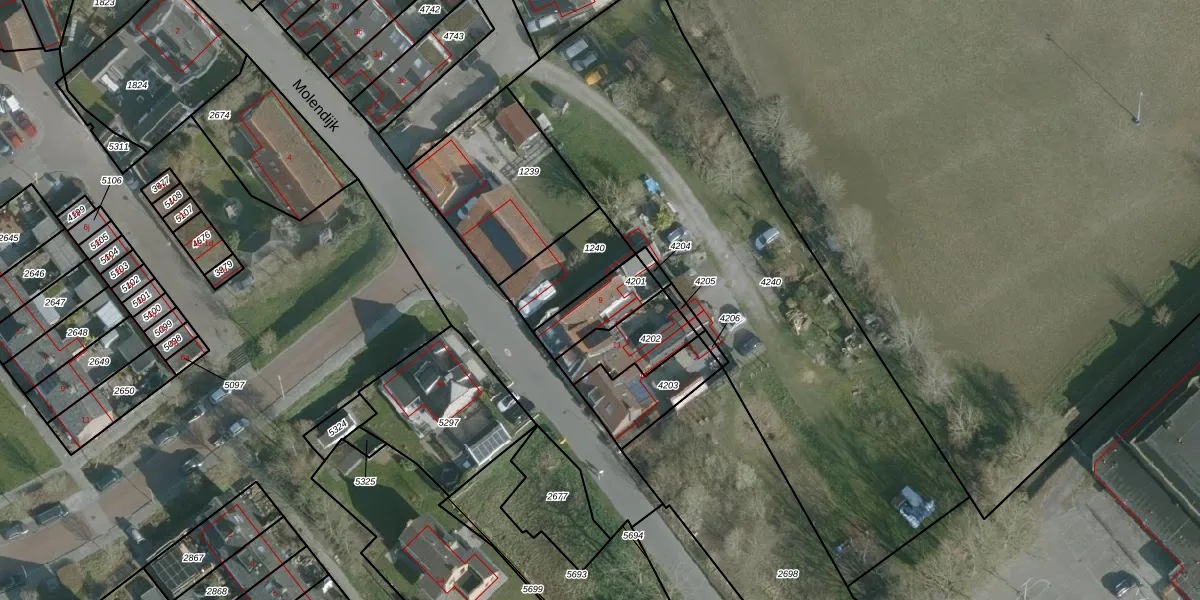 Molendijk 9 is gelegen op kadastraal perceel ZLD01B4201. Deze kadastrale aanduiding is uniek en wordt gebruikt door het Kadaster om eigendomsrechten en andere zakelijke rechten vast te leggen. Het perceel maakt onderdeel uit van de kadastrale gemeente Zuidland.