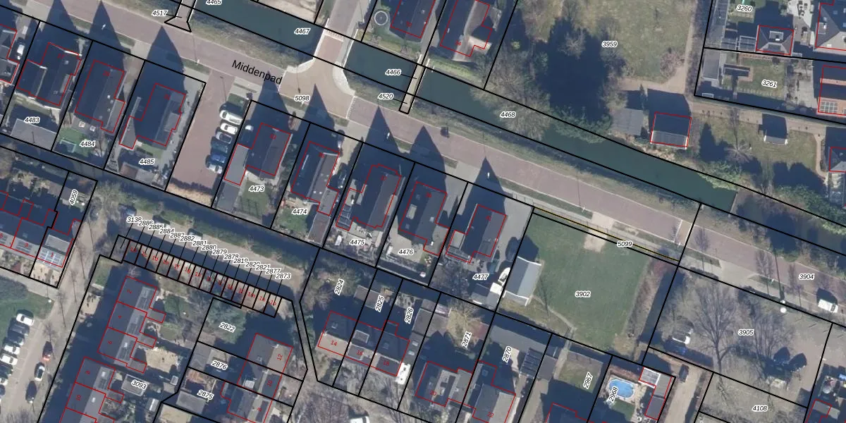 Het perceel waarop Middenpad 39 staat heeft een oppervlakte van 355 m². Dit is een groot perceel. De perceeloppervlakte wordt geregistreerd door het Kadaster. Gedetailleerde informatie over de maten van dit perceel kunt u vinden in het rapport Kadastrale kaart met maatvoering van Middenpad 39.