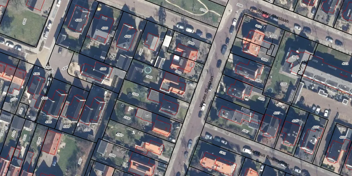 Het perceel waarop Wouter Sluislaan 39 staat heeft een oppervlakte van 485 m². Dit is een groot perceel. De perceeloppervlakte wordt geregistreerd door het Kadaster. Gedetailleerde informatie over de maten van dit perceel kunt u vinden in het rapport Kadastrale kaart met maatvoering van Wouter Sluislaan 39.