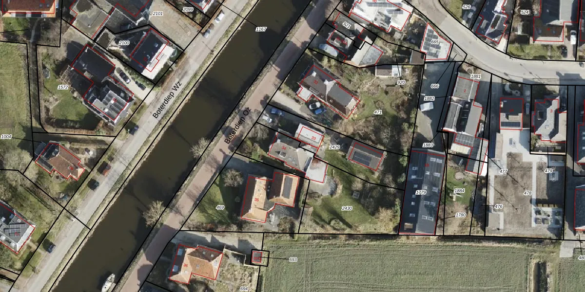 Het perceel waarop Boterdiep Oz 34 staat heeft een oppervlakte van 965 m². Dit is een groot perceel. De perceeloppervlakte wordt geregistreerd door het Kadaster. Gedetailleerde informatie over de maten van dit perceel kunt u vinden in het rapport Kadastrale kaart met maatvoering van Boterdiep Oz 34.