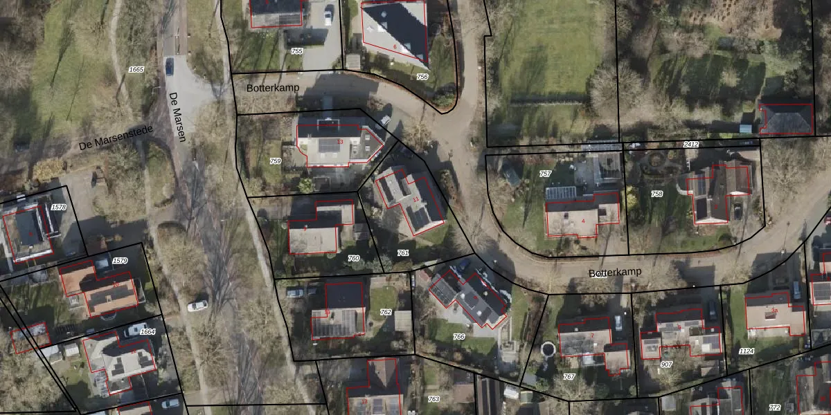 Het perceel waarop Botterkamp 11 staat heeft een oppervlakte van 543 m². Dit is een groot perceel. De perceeloppervlakte wordt geregistreerd door het Kadaster. Gedetailleerde informatie over de maten van dit perceel kunt u vinden in het rapport Kadastrale kaart met maatvoering van Botterkamp 11.