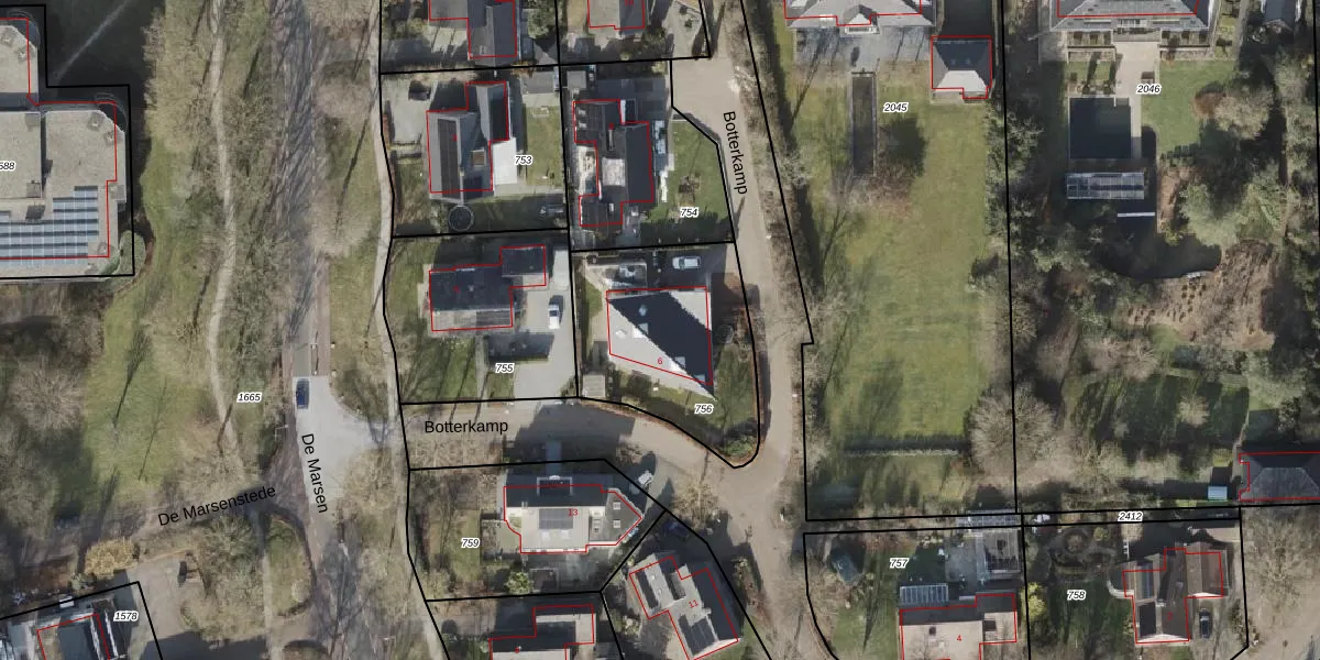 Het perceel waarop Botterkamp 6 staat heeft een oppervlakte van 727 m². Dit is een groot perceel. De perceeloppervlakte wordt geregistreerd door het Kadaster. Gedetailleerde informatie over de maten van dit perceel kunt u vinden in het rapport Kadastrale kaart met maatvoering van Botterkamp 6.