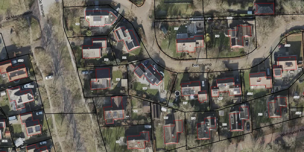 Het perceel waarop Botterkamp 9 staat heeft een oppervlakte van 728 m². Dit is een groot perceel. De perceeloppervlakte wordt geregistreerd door het Kadaster. Gedetailleerde informatie over de maten van dit perceel kunt u vinden in het rapport Kadastrale kaart met maatvoering van Botterkamp 9.