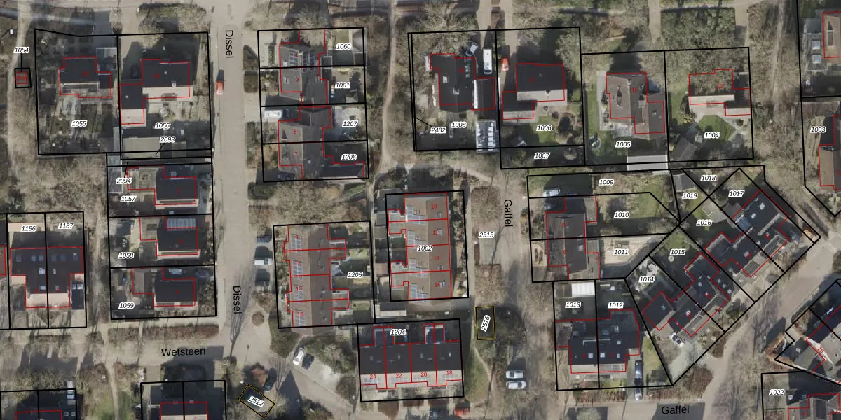 Gaffel 10 is gelegen op kadastraal perceel ZWD02I1062. Deze kadastrale aanduiding is uniek en wordt gebruikt door het Kadaster om eigendomsrechten en andere zakelijke rechten vast te leggen. Het perceel maakt onderdeel uit van de kadastrale gemeente Zuidwolde.