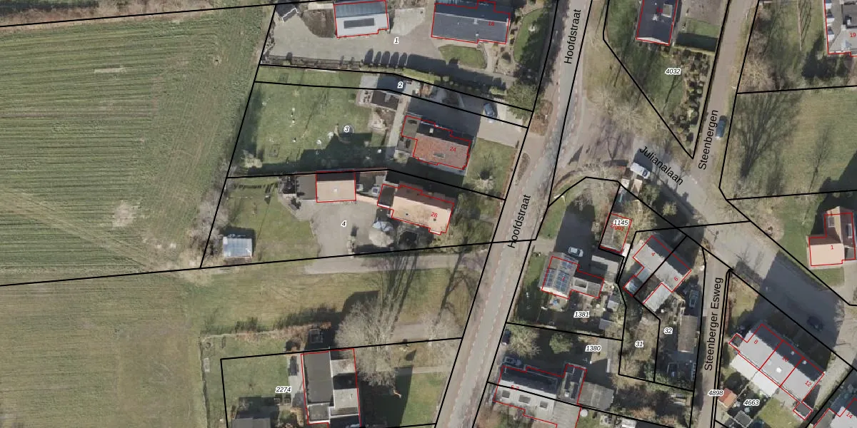 Het perceel waarop Hoofdstraat 26 staat heeft een oppervlakte van 1196 m². Dit is een zeer groot perceel. De perceeloppervlakte wordt geregistreerd door het Kadaster. Gedetailleerde informatie over de maten van dit perceel kunt u vinden in het rapport Kadastrale kaart met maatvoering van Hoofdstraat 26.