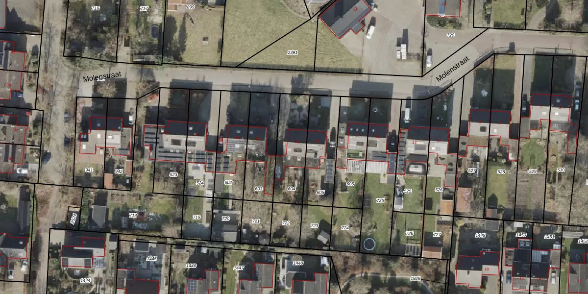 Het perceel waarop Molenstraat 21 staat heeft een oppervlakte van 380 m². Dit is een groot perceel. De perceeloppervlakte wordt geregistreerd door het Kadaster. Gedetailleerde informatie over de maten van dit perceel kunt u vinden in het rapport Kadastrale kaart met maatvoering van Molenstraat 21.