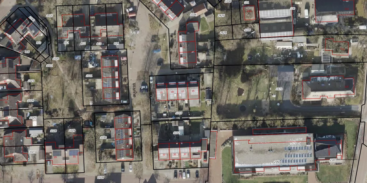 Het perceel waarop Wanne 17 staat heeft een oppervlakte van 844 m². Dit is een groot perceel. De perceeloppervlakte wordt geregistreerd door het Kadaster. Gedetailleerde informatie over de maten van dit perceel kunt u vinden in het rapport Kadastrale kaart met maatvoering van Wanne 17.