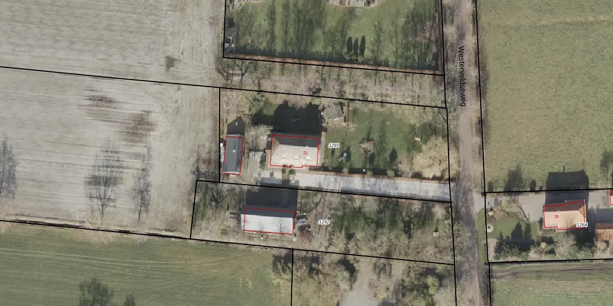 Westerveldseweg 21 is gelegen op kadastraal perceel ZWD02Q1291. Deze kadastrale aanduiding is uniek en wordt gebruikt door het Kadaster om eigendomsrechten en andere zakelijke rechten vast te leggen. Het perceel maakt onderdeel uit van de kadastrale gemeente Zuidwolde.
