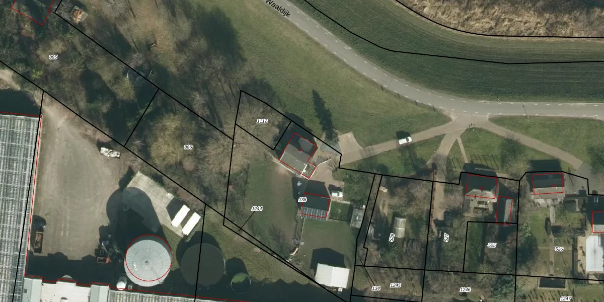 Het perceel waarop Waaldijk 21 staat heeft een oppervlakte van 1780 m². Dit is een zeer groot perceel. De perceeloppervlakte wordt geregistreerd door het Kadaster. Gedetailleerde informatie over de maten van dit perceel kunt u vinden in het rapport Kadastrale kaart met maatvoering van Waaldijk 21.