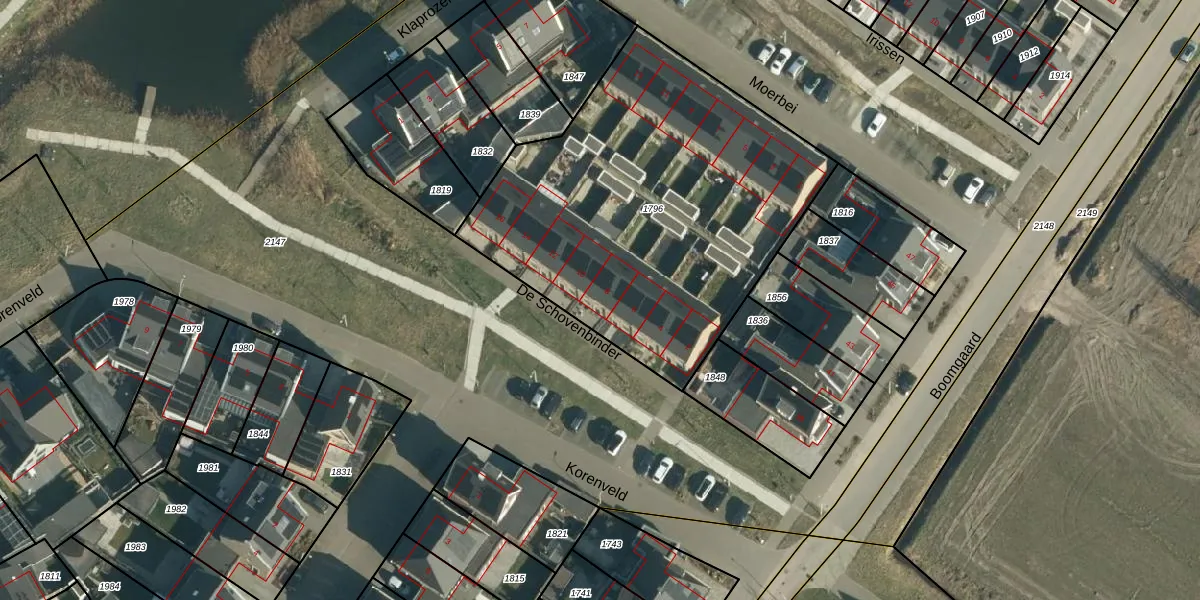 Het perceel waarop De Schovenbinder 8 staat heeft een oppervlakte van 1980 m². Dit is een zeer groot perceel. De perceeloppervlakte wordt geregistreerd door het Kadaster. Gedetailleerde informatie over de maten van dit perceel kunt u vinden in het rapport Kadastrale kaart met maatvoering van De Schovenbinder 8.