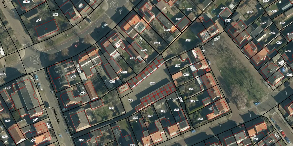 Het perceel waarop Katerstraat 48-G5 staat heeft een oppervlakte van 955 m². Dit is een groot perceel. De perceeloppervlakte wordt geregistreerd door het Kadaster. Gedetailleerde informatie over de maten van dit perceel kunt u vinden in het rapport Kadastrale kaart met maatvoering van Katerstraat 48-G5.