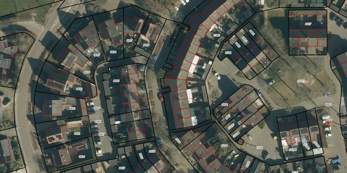 Het perceel waarop Lavendelring 44 staat heeft een oppervlakte van 2127 m². Dit is een zeer groot perceel. De perceeloppervlakte wordt geregistreerd door het Kadaster. Gedetailleerde informatie over de maten van dit perceel kunt u vinden in het rapport Kadastrale kaart met maatvoering van Lavendelring 44.
