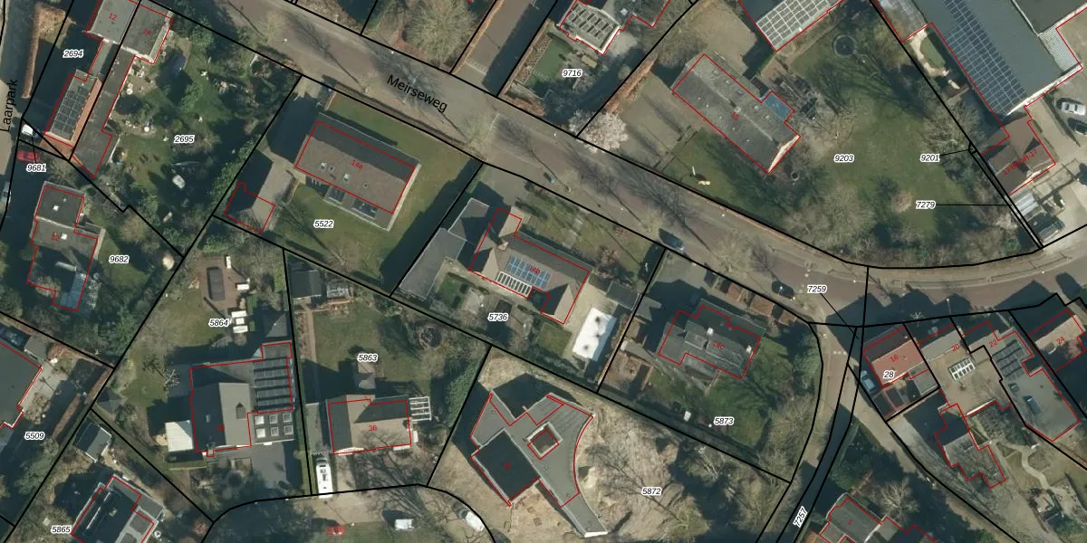 Het perceel waarop Meirseweg 14-b staat heeft een oppervlakte van 1200 m². Dit is een zeer groot perceel. De perceeloppervlakte wordt geregistreerd door het Kadaster. Gedetailleerde informatie over de maten van dit perceel kunt u vinden in het rapport Kadastrale kaart met maatvoering van Meirseweg 14-b.