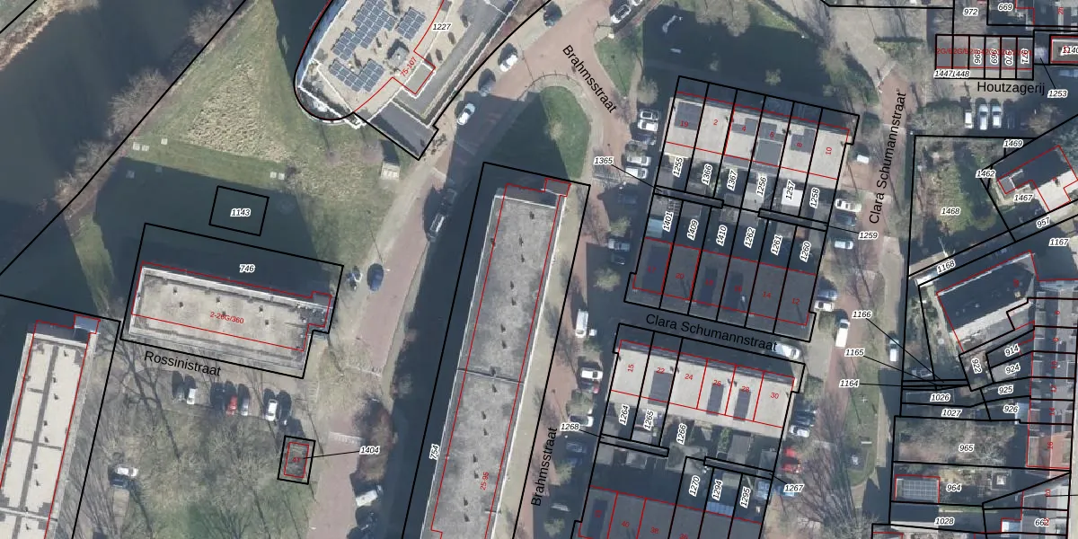 Het perceel waarop Brahmsstraat 25-G-389 staat heeft een oppervlakte van 2106 m². Dit is een zeer groot perceel. De perceeloppervlakte wordt geregistreerd door het Kadaster. Gedetailleerde informatie over de maten van dit perceel kunt u vinden in het rapport Kadastrale kaart met maatvoering van Brahmsstraat 25-G-389.