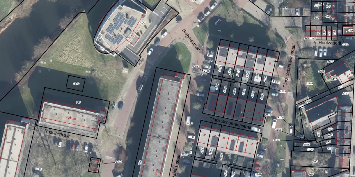 Het perceel waarop Brahmsstraat 25-G-391 staat heeft een oppervlakte van 2106 m². Dit is een zeer groot perceel. De perceeloppervlakte wordt geregistreerd door het Kadaster. Gedetailleerde informatie over de maten van dit perceel kunt u vinden in het rapport Kadastrale kaart met maatvoering van Brahmsstraat 25-G-391.