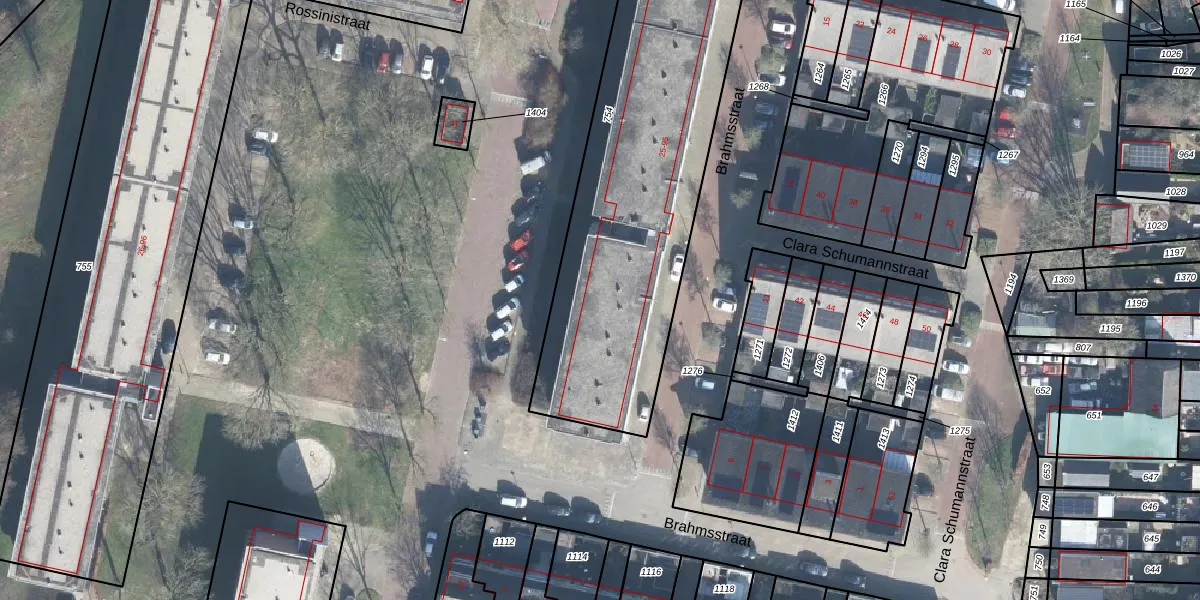 Het perceel waarop Brahmsstraat 43 staat heeft een oppervlakte van 2106 m². Dit is een zeer groot perceel. De perceeloppervlakte wordt geregistreerd door het Kadaster. Gedetailleerde informatie over de maten van dit perceel kunt u vinden in het rapport Kadastrale kaart met maatvoering van Brahmsstraat 43.